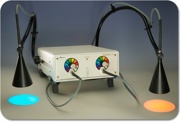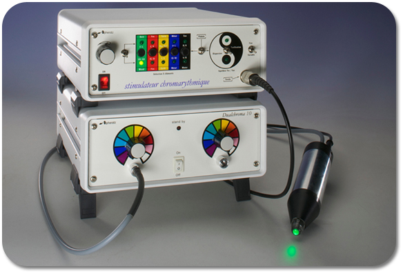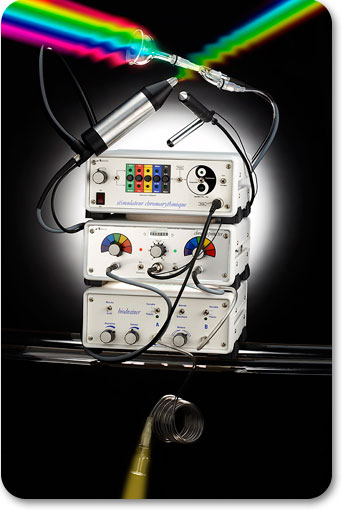 - Chromapuncteur™纯色磁光波仪(色光疗法仪器),利用可见光电磁波的能量频率,有效协调五行元素能量以及主要的能量中心(脉轮)的平衡、激活或释放能量。